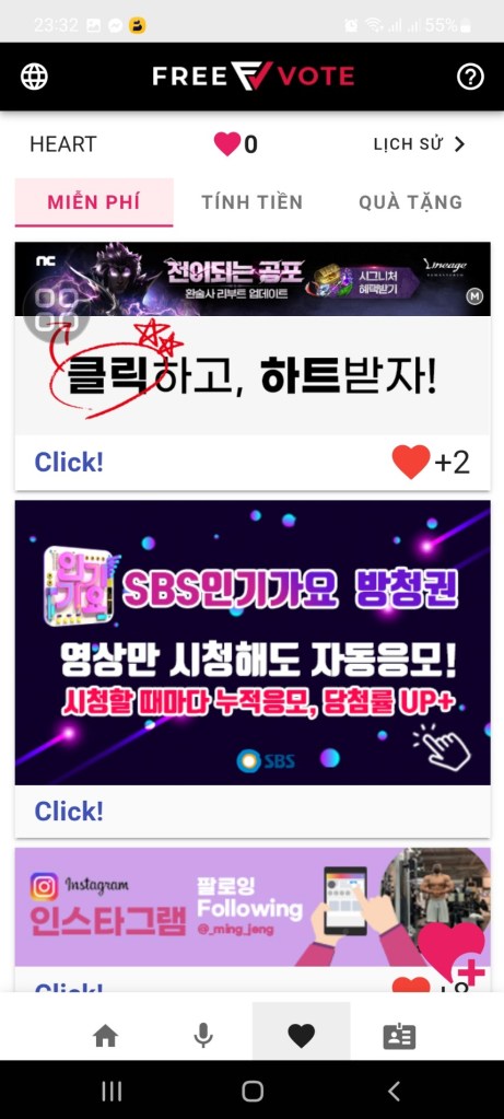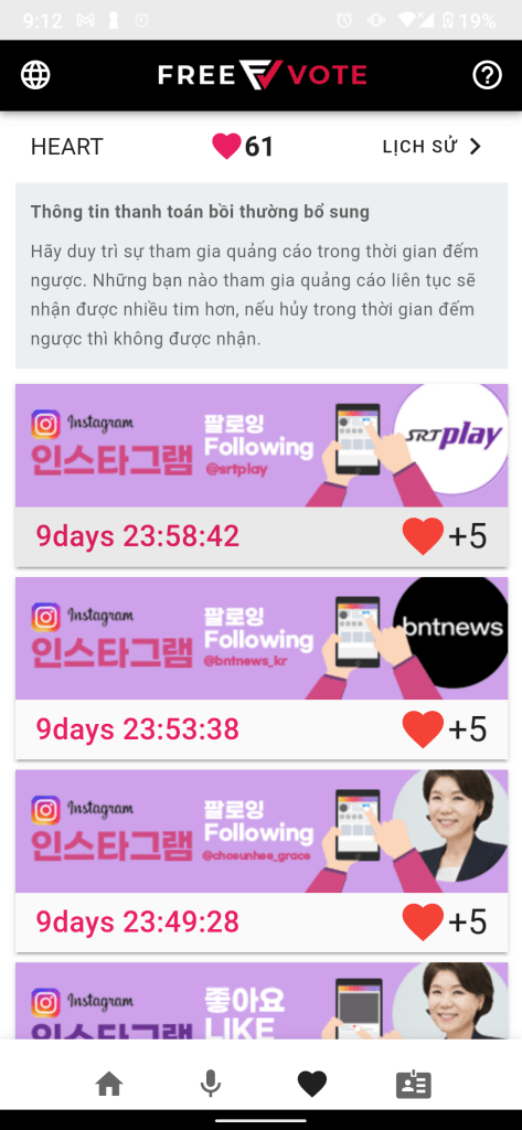 Chú ý: Với app Freevote họ có khung giờ vàng từ 22h-24h Vn xuất hiện tầm 30 ads = 30 tim. Trong ngày trước 1h sẽ có 20 ads sau 1h đến tối có thêm 20 ads ( cái này khá hên xui tùy mỗi ngày, ngày đó app có reset cho thêm tim hay không). Tổng cộng nếu chăm coi quảng cáo mỗi 50s/ cái. Ta sẽ gom được 50-70 tim 1 ngày.