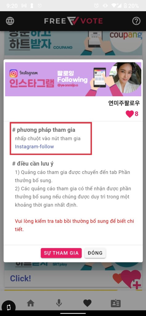 Tuy nhiên một số nhiệm vụ Follow, nếu tài khoản Instagram của bạn chưa Follow tài khoản nhiệm vụ yêu cầu thì sau khi bạn nhấp vào nhiệm vụ –> đi đến acc Instagram của nhiệm vụ –> nhấn Follow –> quay về nơi nhận nhiệm vụ rồi bấm tham gia lại nhiệm vụ đó để nhận tim.